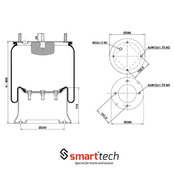 пневмоамортизатор (813MB-O) без стакана H511, верх 4шп. M121*1.75, 1отв. M22*1.5 SAF МАZ ROR Weweler |